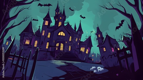 A spooky castle with glowing windows bats circling the sky witches casting spells and ghosts drifting through the courtyard in a comic-style scene