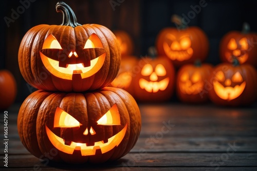 A Spooky Display of Grinning Jack-o-Lanterns Illuminating a Darkened Room, Perfectly Capturing the Spirit of Halloween and Autumn Festivities