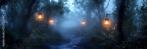 A spooky forest path illuminated by flickering lanterns and surrounded by fog