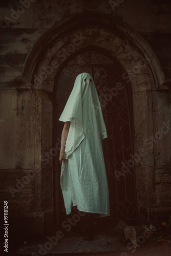 A spooky ghost stands in the dark archway of an ancient castle, evoking the mystique of medieval architecture and the horror of the supernatural. It's Halloween