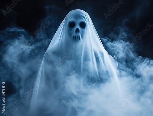 A spooky ghost with a white sheet and a glowing face in smoke.