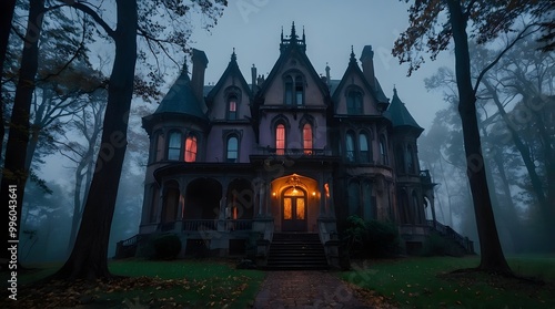 A spooky Gothic Style mansion in the middle of a dark, foggy forest.