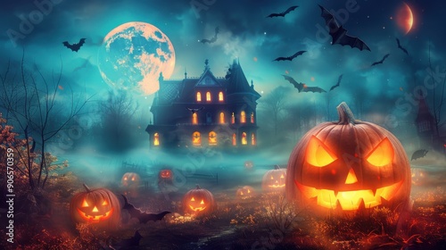 A spooky Halloween background featuring a haunted house silhouetted against a full moon, surrounded by eerie fog, bats flying in the sky, and carved pumpkins with glowing eyes and sinister grins