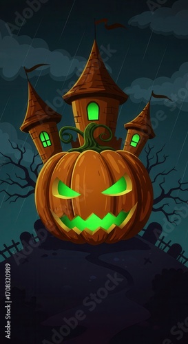 halloween, castle, pumpkin, jack-o-lantern, skittish, dark, rainy, cemetery, illustration, night, haunted, green, orange, brown, cartoon, scarey, design, festive, autumn, autumn, fall, october, beautiful, colourful, bright, creative, modern, elegant, stylish, professional, decorative, vibrant, stunning, amazing, marvellously, fantastic, gorgeous, lovely, charming, attractive, impressive