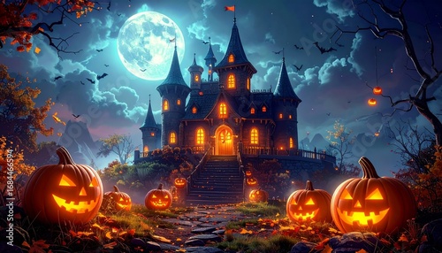 A spooky Halloween night illustration with a haunted castle, jack-o'-lanterns, and bats silhouetted against a full moon