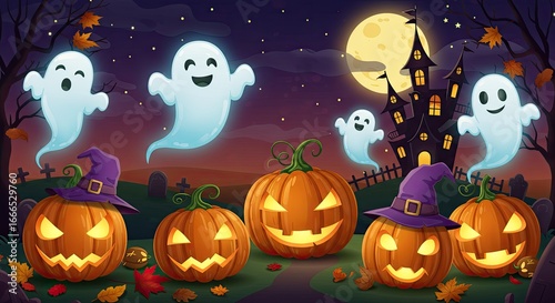 A Spooky Halloween Night with Glowing Pumpkins, Friendly Ghosts, and a Haunted House Under the Full Moon for a Fun