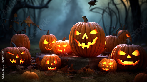 A spooky halloween pumpkin, Jack O Lantern, with an evil face and eyes on the grass in a graveyard with a misty night sky background.