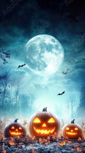 A spooky Halloween scene featuring a glowing jack-o'-lantern under a full moon.