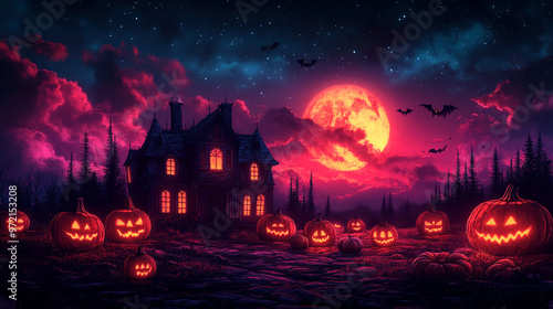 A spooky Halloween scene featuring a haunted house, glowing pumpkins, and a full moon.