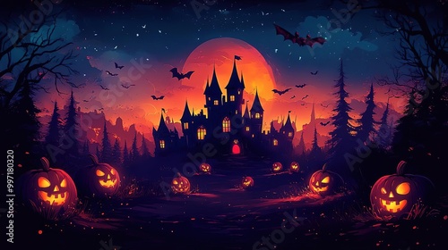 A spooky Halloween scene with a haunted castle, glowing pumpkins, a full moon, and bats flying under a dark, starry sky.