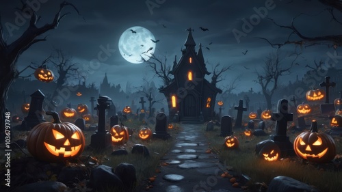 A spooky Halloween scene with a haunted church, jack-o'-lanterns, and a graveyard under a full moon.