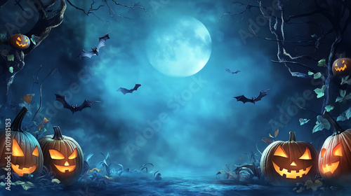 A spooky Halloween scene with glowing jack-o'-lanterns, bats flying, and a full moon in a misty forest.
