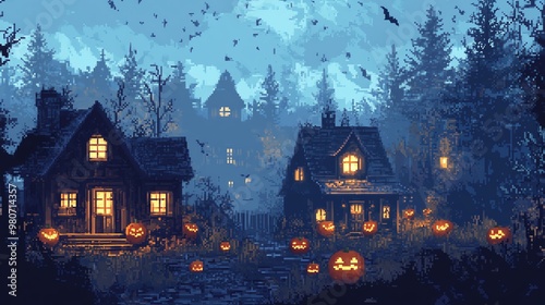 A spooky Halloween scene with glowing pumpkins and eerie houses set against a misty forest backdrop under a twilight sky.