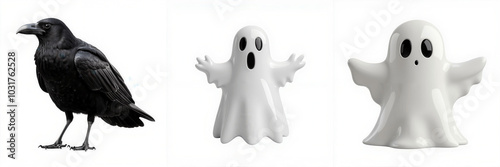 A spooky trio featuring a black crow and two playful ghost figures, ideal for Halloween-themed decor or imagery.
