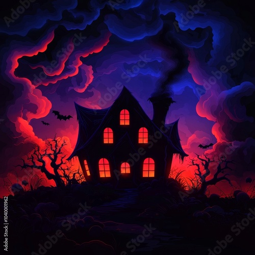 A spooky, vividly colored haunted house under a dramatic sky, surrounded by bats and eerie trees, evoking a Halloween atmosphere.