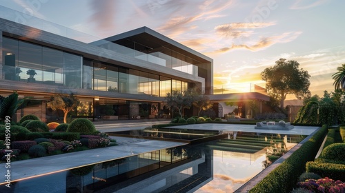 A sprawling modern mansion with sleek glass windows reflecting the setting sun