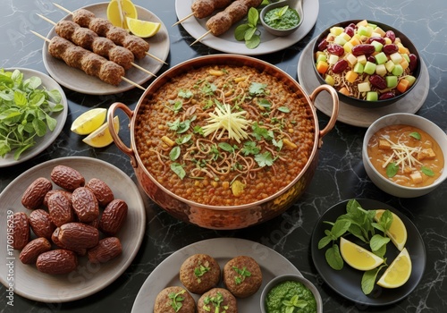 A spread of middle eastern dishes including lentil stew, kebabs, dates, and a fruit salad on a table