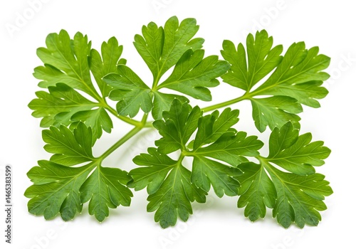 A sprig of fresh parsley with vibrant green leaves on a plain white surface in a close up view