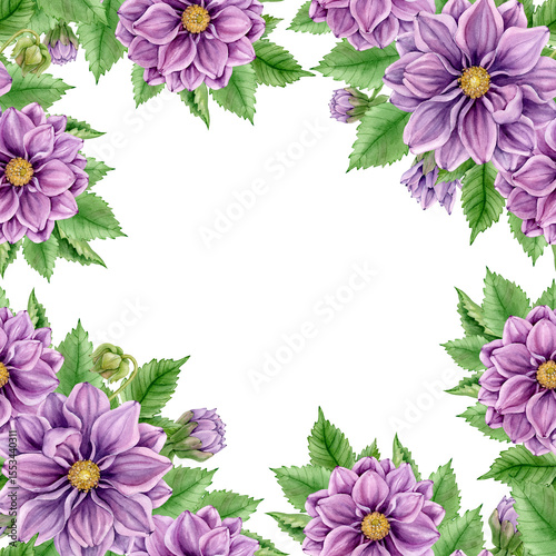 dahlia, frame, watercolor, blossom, bud, floral, botany, leaf, border, greeting, bright, flora, isolated, holiday, summer, beautiful, composition, postcard, romantic, design, season, event, decoration, green, natural, nature, invitation, bouquet, leaf, flower, foliage, square, print, congratulation, plant, purple, garden, illustration, card, hand-drawn