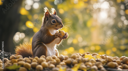 A squirrel eating a hazelnut, surrounded by a pile of nuts, in an autumn forest with sunlight filtering through the trees.