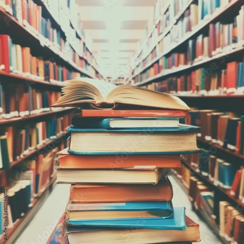 A stack of colorful books in a library with shelves in the background.