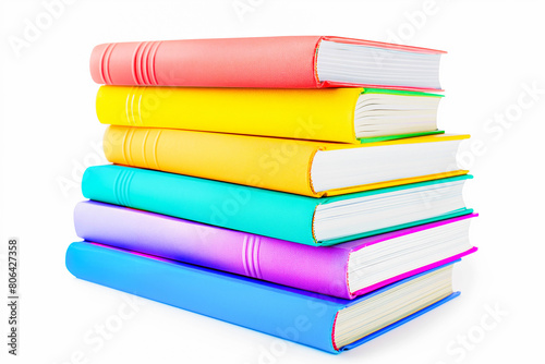 A stack of colorful books, neatly arranged in a pyramid shape, with titles and spines clearly visible. The background is a bright, clean white.
