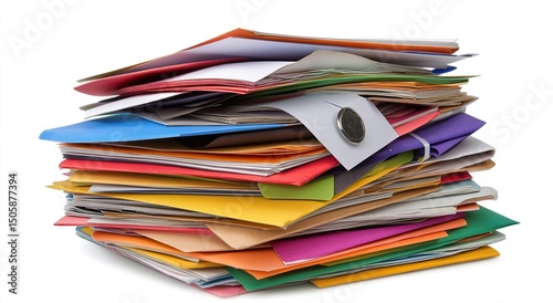 A stack of colorful envelopes isolated on a white background with a clipping path, studio shot.