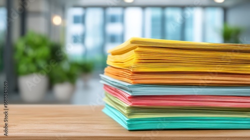 A stack of colorful paper sheets is neatly arranged on a wooden desk with a blurred modern office background