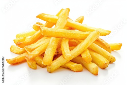 A stack of crispy fried potatoes on a clean white surface, ready for serving