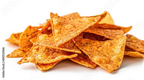 A stack of crispy tortilla chips on a clean white surface, perfect for snacking or as a prop in food photography