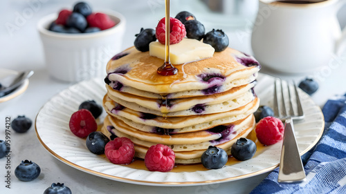 fluffy, blueberry, stack, fresh, berry, butter, pat, maple, sirup, drizzle, white, porcelain, plate, fork, ai, served, sweet, delicious, satisfying, textured, classic, meal, comforting, vibrant, delightful, crafted, inviting, rich, flavorful, gold, charming, appetising, breakfast, elegant, traditional, hearty, tasty, appealing, indulgent