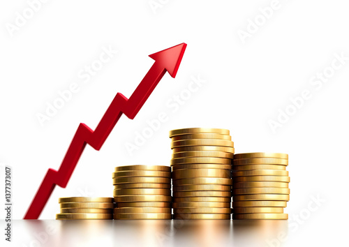 A stack of gold coins with a rising red arrow, representing financial growth and increasing profits in a corporate world.