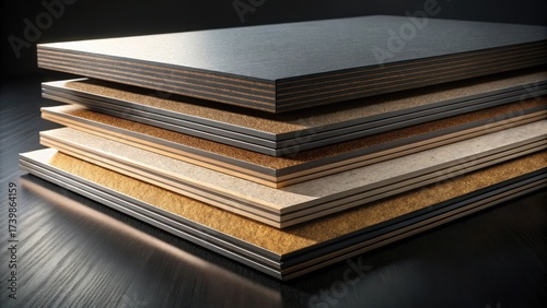A stack of layered composite material samples showcasing diverse textures and colors for interior design projects