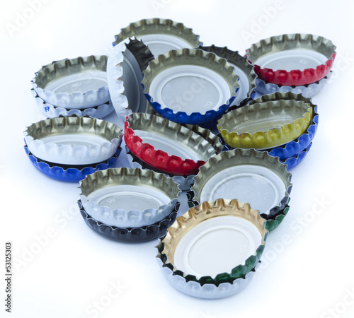 isolated, isolated on white, white background, stack, pile, upside down, cap, lid, cork, metal, bottle cap, recycling, reusing, garbage, trash, nobody, still life, aluminium, red, black, green, blue, gold, gasket, heap, soda, cola, environmental conservation, waste