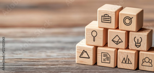 A stack of wooden blocks with various symbols representing business concepts, set against a rustic wooden background.