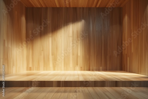 A stage with a smooth, light wood floor and a matching wooden backdrop, creating a warm, minimalist setting.