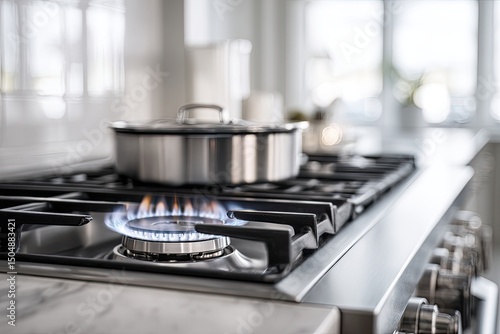 stove, gas, cooktop, burner, flames, fire, heat, kitchen, pot, pan, cooking, stainless, steel, silver, metal, modern, contemporary, clean, bright, light, simmering, boiling, food, appliance, home, interior, design, luxury, elegant, style, shine, glossy, smooth, white, marble, countertop, hob, range, culinary, warmth, domestic, epicure, receipe, preparation, delicious, tasty, appetising, comfort