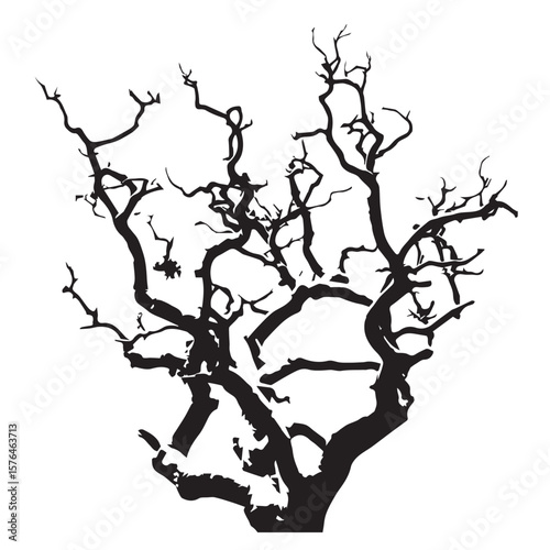 tree, silhouette, black-and-white, leafless, branch, gnarled, twisting, bare, nature, organic, design element, isolated, white background, vector, graphic, art, abstract, pattern, texture, winter, latently, dead tree, skittish, eerie, haunting, minimalist, clean, simple, contrast, shape, form, outline, branching, wood, plant, botanical, wild, forest, tree trunk, tree branch, isolated on white, cut-out, graphic design, illustration, stylised, artistic, dark