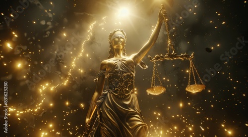 A statue of a woman holding a scale with a golden glow surrounding her, Themis or Lady Justice concept