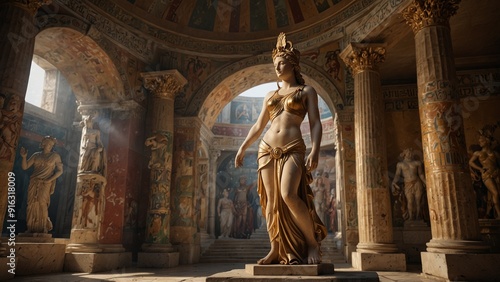 A statue of Hera inside an ancient Greek temple, with magnificent murals and a domed arch in the background.