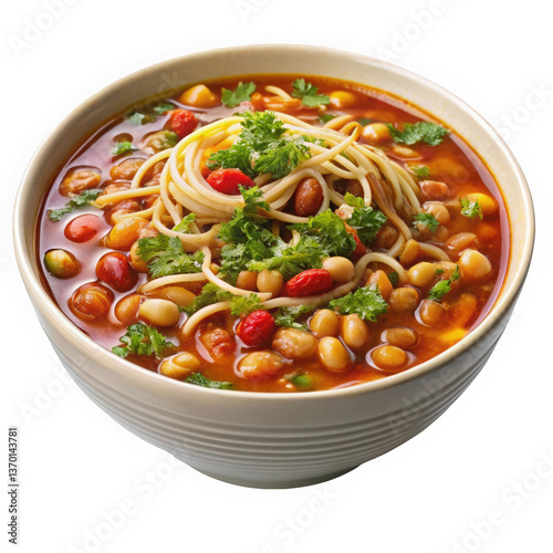 A steaming bowl of colorful noodle soup loaded with beans and garnished with fresh herbs, creating an appetizing and vibrant dish.