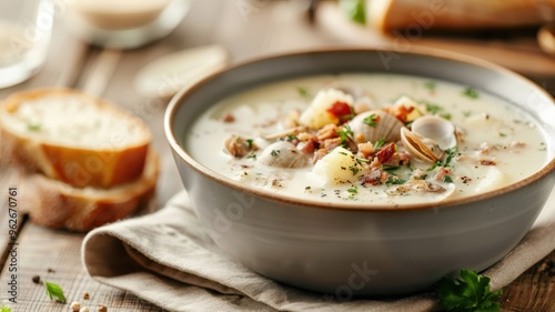 A steaming bowl of creamy clam chowder with tender clams, potatoes, and bacon.