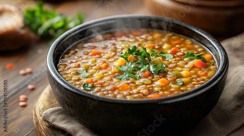 A steaming bowl of lentil soup with vegetables