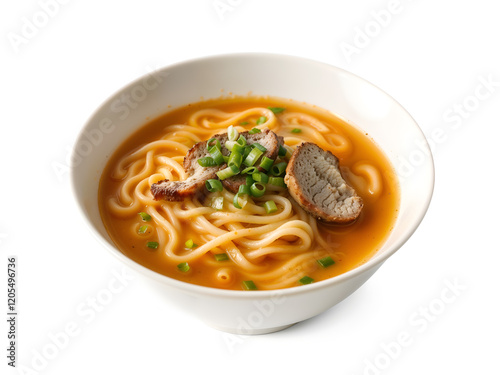 A steaming bowl of ramen noodles with vibrant garnish, symbolizing comfort food and delicious meals isolated on white background. Generative AI