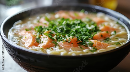 A steaming bowl of salmon soup, adorned with delicate egg noodles and a sprinkle of fresh parsley, a comforting and flavorful meal.