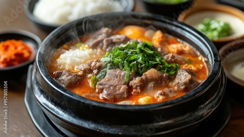 A steaming bowl of Samgyetang in a black stone pot, served with traditional Korean side dishes and a bowl of white rice, capturing the vibrant food culture of Busan