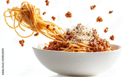 A steaming bowl of spaghetti bolognese bursting mid-air with slow-cooked meat sauce, flying pasta strands, and grated cheese, clean white background