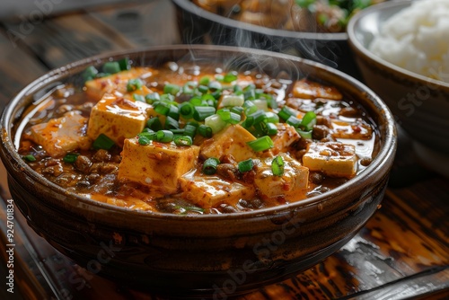 A steaming bowl of tofu in spicy sauce, garnished with green onions, served with rice.