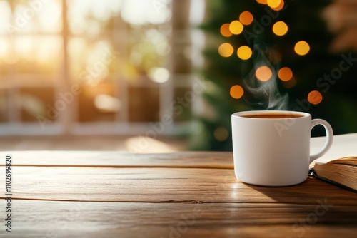 A steaming coffee mug rests on a wooden table, with a blurred background of bokeh lights and a window, evoking warmth and coziness in a calm setting.