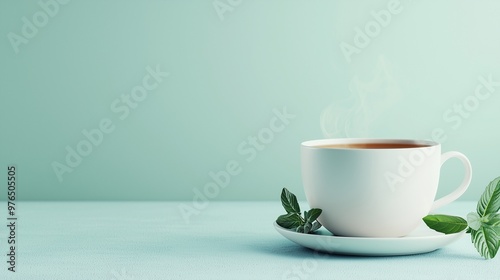 A steaming cup of coffee sits elegantly on a mint green surface, complemented by fresh mint leaves for a refreshing touch.